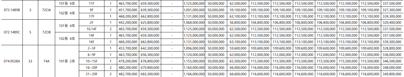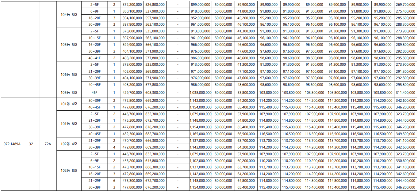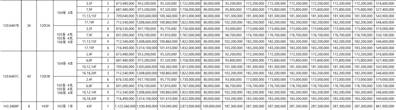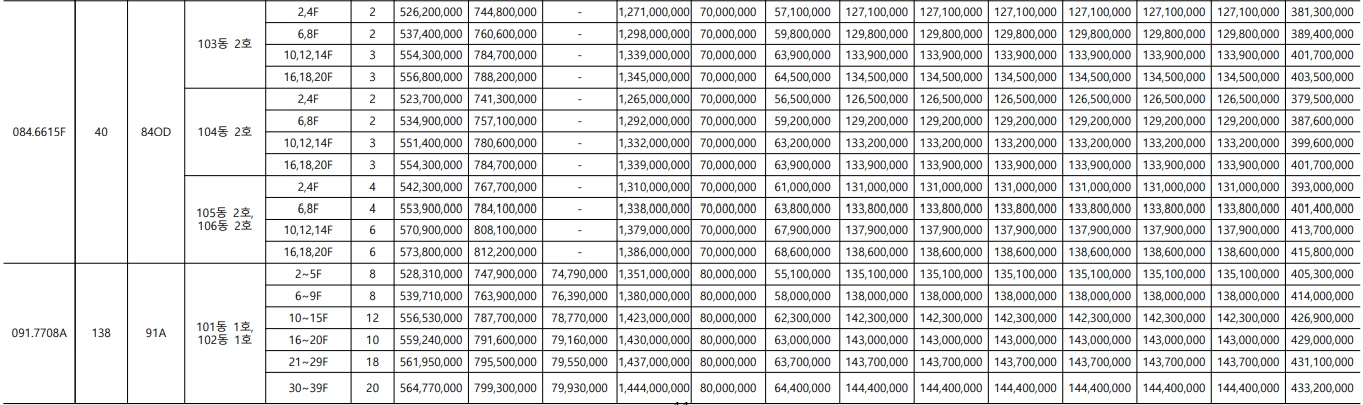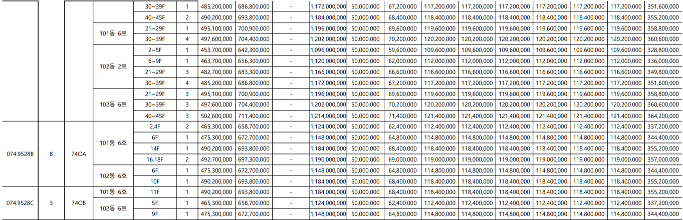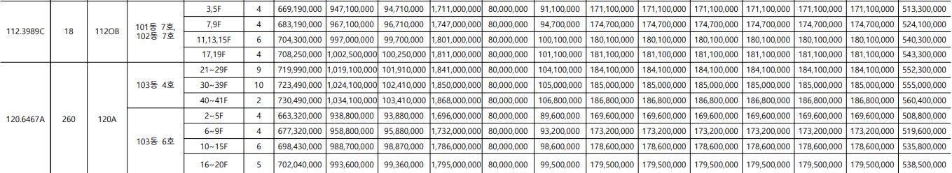 서울원 아이파크는 주택 타입이 아주 다양한 아파트입니다. 가장 작은 평수는 전용면적 59인 25평부터 가장 큰 평수는 전용면적244입니다. 각 전용면적 당 1~6가지로 다양한 타입이 있습니다. 타입별, 그리고 층별로 분양가가 다 다르니 아래 표에서 확인하세요.