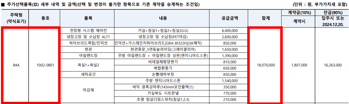 84A 타입인 1002동 801호, 84C 타입인 1002동 723호는 시스템 에어컨을 포함한 다수의 유상옵션을 계약했습니다. 따라서 해당 세대에 당첨되면 기존 계약 그대로 승계하는 조건으로 아래의 유상 옵션 비용을 모두 납부해야 합니다.